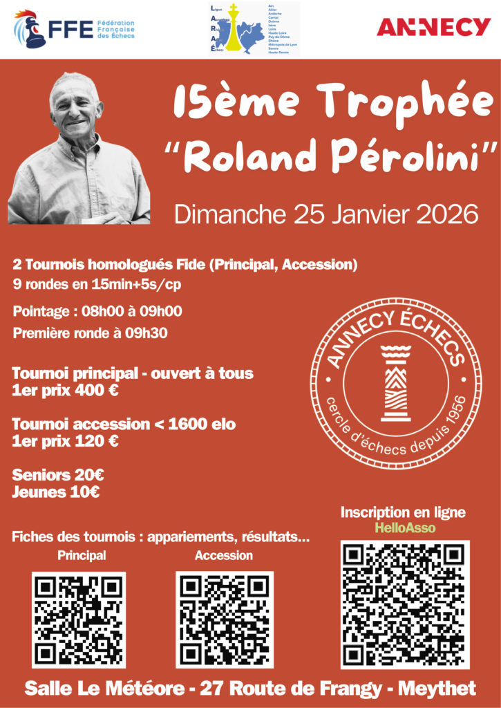 Point d’orgue de la saison échiquéenne à Annecy, le trophée Pérolini (anciennement tournoi de Bonlieu), ainsi nommé en hommage à un joueur emblématique du club, rassemble chaque saison une centaine de joueurs venus de la région et d’ailleurs.