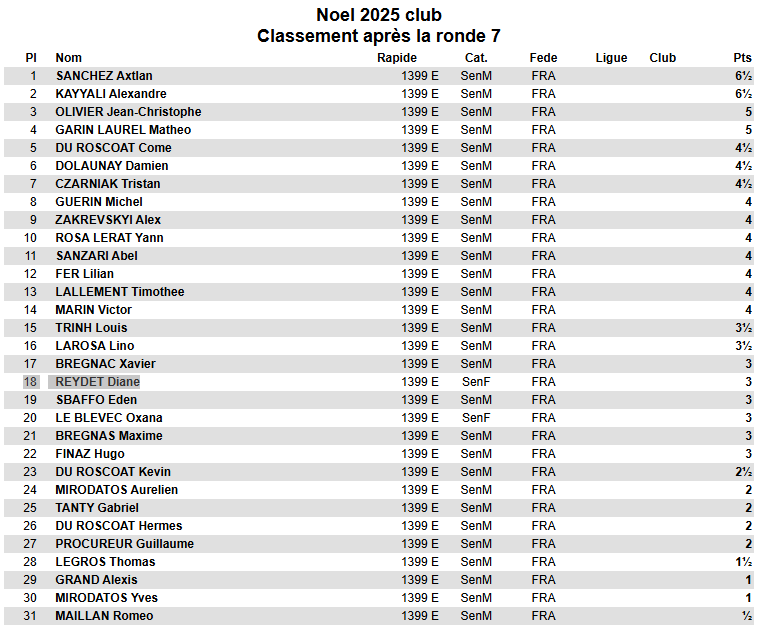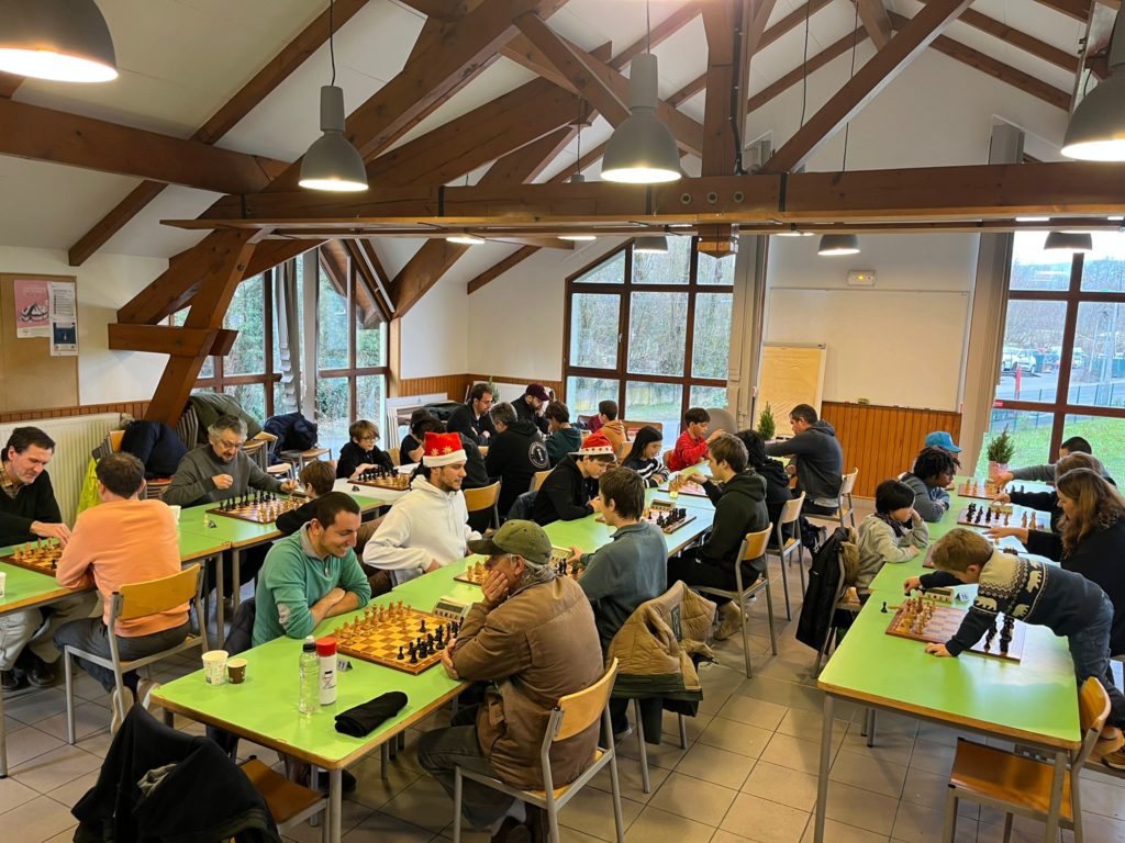 La deuxième partie de la journée s’est poursuivie avec un tournoi rapide amical ouvert à tous, histoire de jouer encore quelques parties avant de tourner la page de l’année 2025. Pas moins de 31 participants, du plus jeune au plus expérimenté, avec des classements allant d’environ 999 à 2200 Elo, dames et messieurs, parfois plusieurs membres d’une même famille, tous réunis par la même passion.
